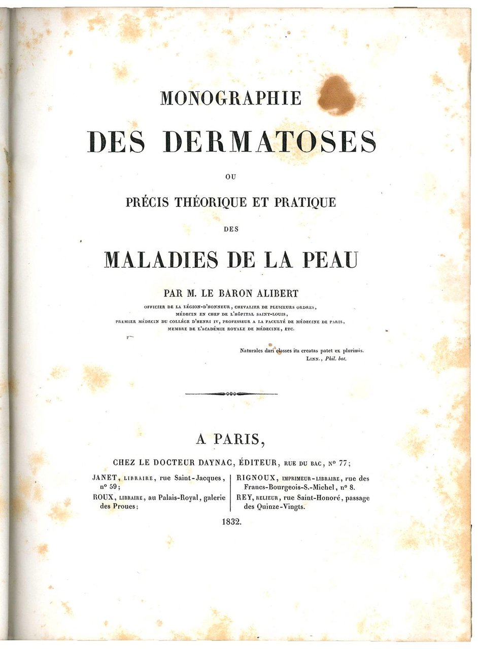 Alibert was chief physician at the Saint-Louis Hospital (1768-1837), first ordinary physician of King Charles X and founder of the French school of dermatology.