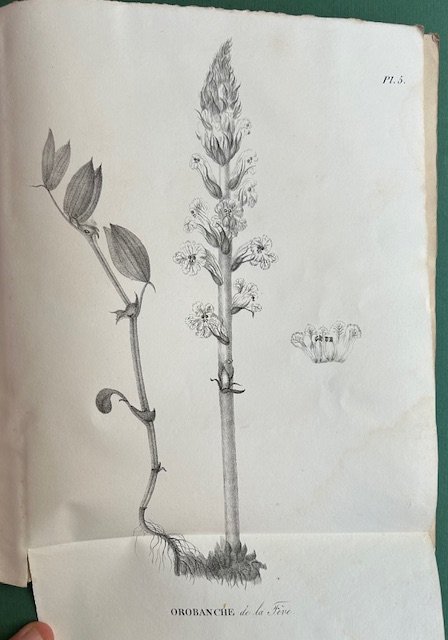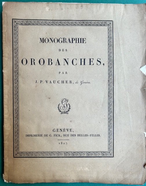 In-4°, pp. (8), 72, 16 tavv. in b.n. in litografia f.t., brossura editoriale, lievi lacune la dorso. Prima edizione di rara opera botanica sulle piante orobancacee di Jean-Pierre Vaucher (Ginevra, 1763-ivi, 1841). Precettore (ebbe tra i suoi allievi Carlo Alberto) e rettore dell'Accademia ginevrina, fu soprattutto importante studioso delle alghe. A lui De Candolle dedicò il genere di alghe Vaucheria. Le piante di questo genere sono alte da 1 a 5 dm (raramente superano i 60 cm). La forma biologica prevalente è terofita parassita (T par), ossia sono piante erbacee che differiscono dalle altre forme biologiche poiché, essendo annuali, superano la stagione avversa sotto forma di seme e sono munite di asse fiorale eretto e spesso privo di foglie. In questo genere sono presenti anche piante con forme biologiche perenni tipo geofite parassite (G par), e sono piante provviste di gemme sotterranee e radici provviste di organi specifici per nutrirsi della linfa di altre piante. Inoltre non contengono clorofilla per cui nel secco si colorano di bruno Nissen, 2043. Pritzel, 9707.