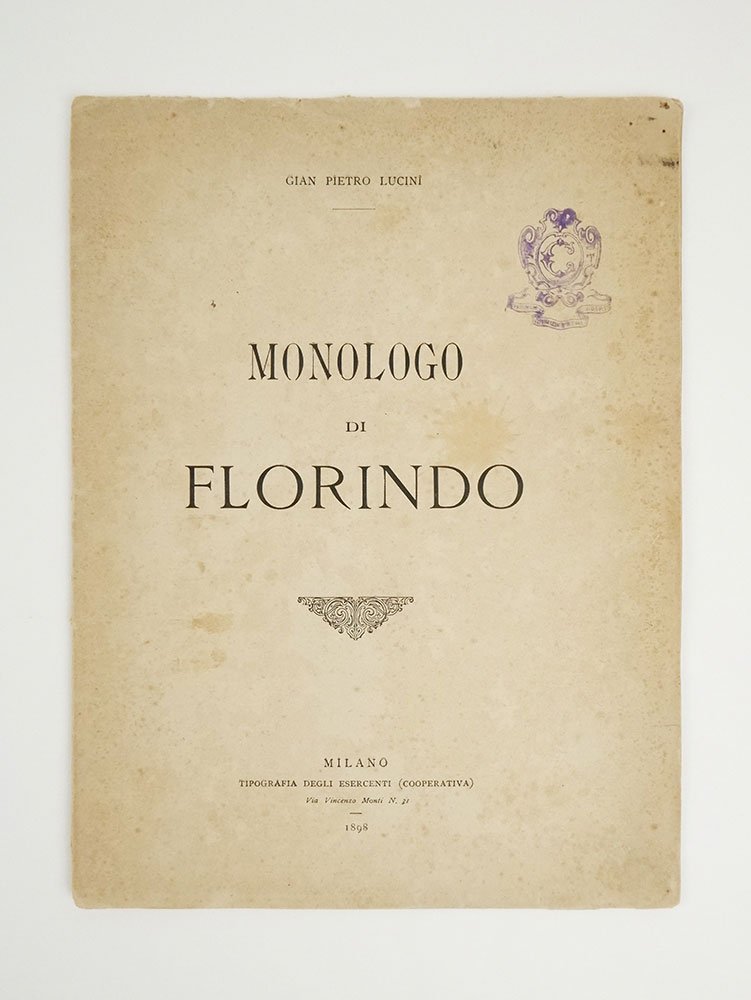 LIBROEdizione originale.CON AUTOGRAFO.Esemplare pregiato da due lunghe iscrizioni autografe dell’autore, una firmata e datata «GP Lucini XXVIi Gennajo 98» e vergata al recto dell’ultima carta, l’altra in testa al frontespizio datata «Xviij [19] di maggio 98», per complessive undici fitte righe di testo letterario che approfondisce il significato dell’opera nel contesto degli altri «Monologhi» luciniani. Timbro di possesso «Biblioteca la Ricciardetta» al piatto anteriore e al frontespizio; separazione lungo la cerniera di dorso, normali marginali segni del tempo; un ottimo esemplare.Rarissima placchetta, pubblicata a spese dell’autore, parte del ciclo dei «drammi delle maschere». «Si delineava parallelamente la componente satirica della ricerca di Lucini che, risalendo ai grandi modelli di Parini e Porta, poteva agevolmente essere ricondotta all'interno di una oramai ben definita "linea lombarda", nutrita di concretezza tematica e di partecipazione etico-civile. Lo scopo era quello di cogliere le contraddizioni che si annidavano nella falsa coscienza della società, demistificandone le ipocrisie e i pregiudizi. Nascevano così gli “Episodi” dei cosiddetti “Drammi delle maschere”, pubblicati nel 1898 a spese dell'autore (Il monologo di Florindo, Il monologo di Rosaura, I monologhi di Pierrot, L'intermezzo dell'Arlecchinata), in cui la polemica e la denuncia assumevano la forma della confessione teatrale versificata». (G. Zaccaria, voce DBI vol. 66, 2006).