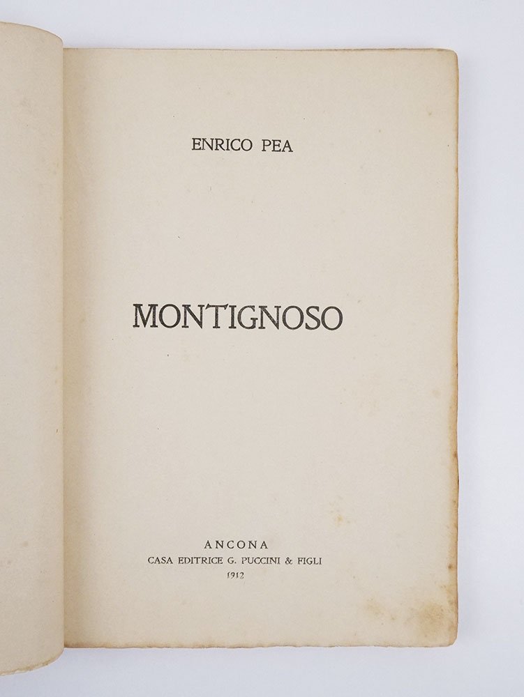 LIBROEdizione originale.Dorso muto restaurato professionalmente, prima e ultima carta normalmente brunite e alcune leggere fioriture sparse su carte complessivamente fresche e pulite; nel complesso un ottimo esemplare di questo raro libro con la splendida copertina a colori di Lorenzo Viani.Rarissima opera seconda — una raccolta di versi senza titolo, sorta di poema corale — pubblicata dall’editore Puccini che, grazie al figlio Mario, giovane poeta per pochissimo anche futurista, aveva deciso di accogliere nel suo catalogo libri di versi di autori giovani e per lo più (all’epoca) sconosciuti. Libro assai elegante, stampato su carta forte in barbe e ornato da una notevolissima copertina interamente disegnata da Lorenzo Viani in vena «orrorosa», come la definirà Gianfranco Contini (si veda Cortellessa in «La sabbia e il marmo», Roma 2012, p. 41). «Viani si era avvicinato all’illustrazione del libro senza alcuna esperienza in materia, nel bel mezzo della lettura appassionata ma disordinata di romanzi popolari [.]. Egli non si è ancora fatto un’idea del bel libro composto con caratteri scelti e secondo precisi criteri d’impaginazione; ogni volta che gli si presenta un impegno editoriale, si preoccupa soprattutto di calare nelle sue immagini le attese e le ribellioni dei “trascurati” e dei “maledetti da Dio” [.]. [.] la copertina di un altro libro del nostro scrittore [Enrico Pea] – “Montignoso”, edito ad Ancona nel 1912 – si ricollega chiaramente allo spirito competitivo e all’umore macabro di “Fole”; e, anche se l’immagine trova rispondenza in un passo del nuovo libro, è plausibile che costituisca una ripresa o una variante di una illustrazione perduta» (Pacini).Bibl. Pacini, Le illustrazioni di Viani per «Fole» di Enrico Pea (Rara volumina 1995/2: 59-72), fig. 11.