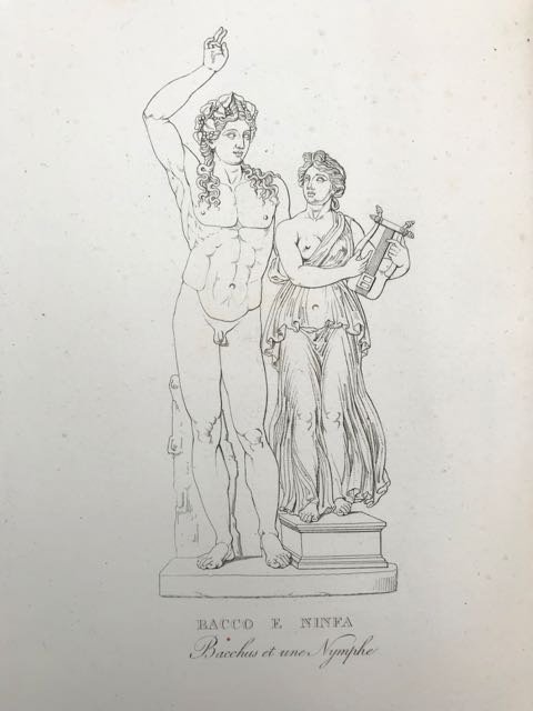 In-4° (cm. 28), legatura del XX secolo in m. pelle chiara e angoli con titolo in oro su tassello (lievi usure); pp. LXXXVII [1] 352 [16] con 57 tavole illustrative f.t. in fine (anche ripiegate) e 1 tavola di ritratto di Pio VII in antiporta; fioriture e bruniture, lieve gora al margine delle ultime tavole, margine interno delle prime carte rinforzato. Traduzione francese dell'ultimo tomo a sé stante della monumentale opera di Ennio Quirino Visconti, a cui presero parte suo fratello e il Guattani. «E' l'opera più classica ch'abbia dato la scienza antiquaria in Italia» [Gamba 2687]. Esemplare più che discreto. (NJ9)