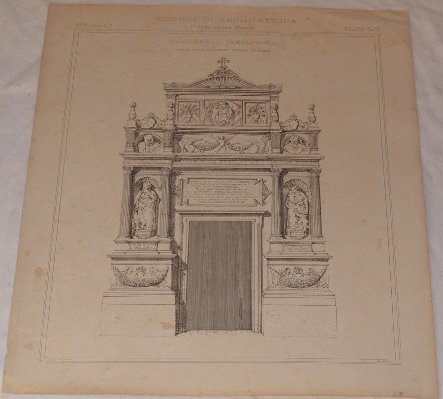 Bella litografia di architettura del 1878 tratta dal periodico mensile "Ricordi di architettura" pubblicato tra il 1878 e il 1900 diretto da Giacomo Roster, C. Corinti e E. Bartoli.<BR>La rivista documentava le numerose progettazioni, talvolta anche di riduzione e di ampliamento che fecero molti architetti dell'epoca. Di grandi dimensioni. TECNICA: Litografia DIMENSIONI FOGLIO: cm 52x38 DIMENSIONI INCISIONE: cm 45x32 EPOCA: 1878 CONDIZIONI: Buone condizioni, qualche fioritura. Beautiful lythography of architecture of 1878 taken from the monthly magazine "Ricordi di architettura" published between 1878 and 1900 directed by Giacomo Roster, C. Corinti and E. Bartoli. The magazine documented different projects, sometimes alos of reductioning and expansion done by many architects of that time. Of big size. TECHNIQUE: Lytography PAGE SIZE: cm 52x38 PRINT'S SIZE: cm 45x32 PERIOD: 1878 CONDITION: good conditions. Some yellowings and little missing parts in the edges.
