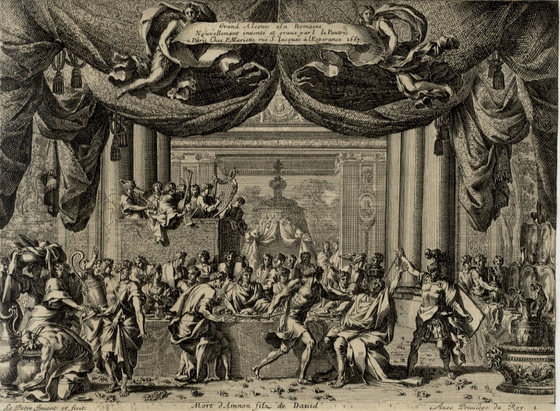 Paris, chez P. Mariette, 1667, incisione in rame all'acquaforte firmata in lastra: Le Potre invent et fecit. Mm. 215x291 (il foglio, rifilato alla cornice dell'immagine su tre lati, lasciando qualche millimetro di margine bianco oltre il filetto che delimita l'immagine sul lato inferiore, margine bianco che reca il titolo inciso). Tavola della serie "Grand alcoves a la romaine". Buone condizioni.
