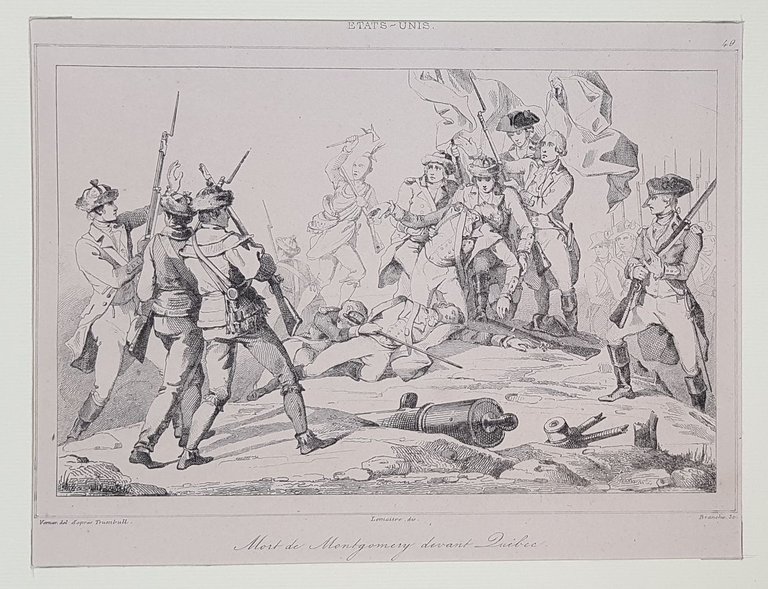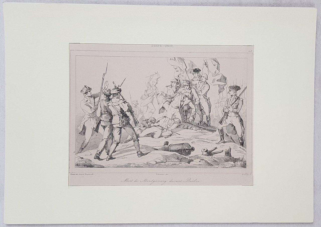 Bella veduta animata del 1865 circa del Generale Montgomery a Quebec montati in passepartout. Autore: Branche su soggetto di Vermer Data: 1865 circa Tecnica: acquaforte Dimensione foglio: 17,5x25 cm Dimensione incisione: 11,5x15 cm Condizioni: Buone. Rare fioriture.Beautiful animated view of death of General Montgomery in Quebec of 1865 circa mounted in a passepartout. Author: Branche after Vermer Date: 1865 circa Technique: Steel etching Passepartout Dimension: 17,5x25 cm (6.9x9.8 inches) Engraving Dimension: 11,5x15 cm (4.5x5.9 inches) Conditions: Good conditions.