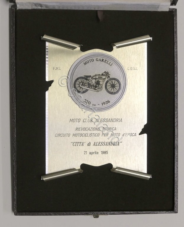 Moto Club Alessandria - Targa Rievocazione storica Circuito Motociclistico per Moto d'epoca - Moto Garelli - 21 Aprile 1985 Dimensioni targa: 12 x 15 cm ca. Inclusa scatola. Condizioni molto buone.
