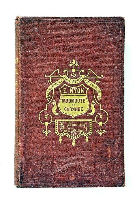 340 pages. (18x12 Cm). Pleine toile rouge estampée de fers à froid, décors titres, et tranches dorés. Reliure de la collection. Coins et coiffes émoussés. Plats un peu frottés. Première édition. Auteur de très nombreux ouvrages pour la jeunesse, dont le célèbre "Colon de Mettray", Eugène Nyon, grand promoteur de l'Enseignement Mutuel, produit ici, un récit dont le titre choisi pour la deuxième édition rapporte le sujet: "Moumoute, histoire d'un chat griffonné par lui-même et les aventures de Carnage chien racontées par son ami Moumoute". Ces "Mémoires" de chat et chien,("pattuscrit"), sont illustrées par Télory, qui signe les vignettes du texte dont 9 sont à pleine page. Quelques rousseurs pâles et un cerne très clair en coin de quelques feuillets, mais bon exemplaire dans l'ensemble.