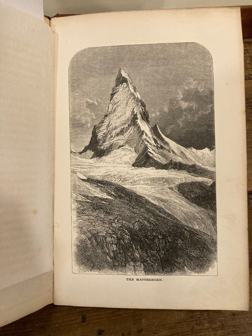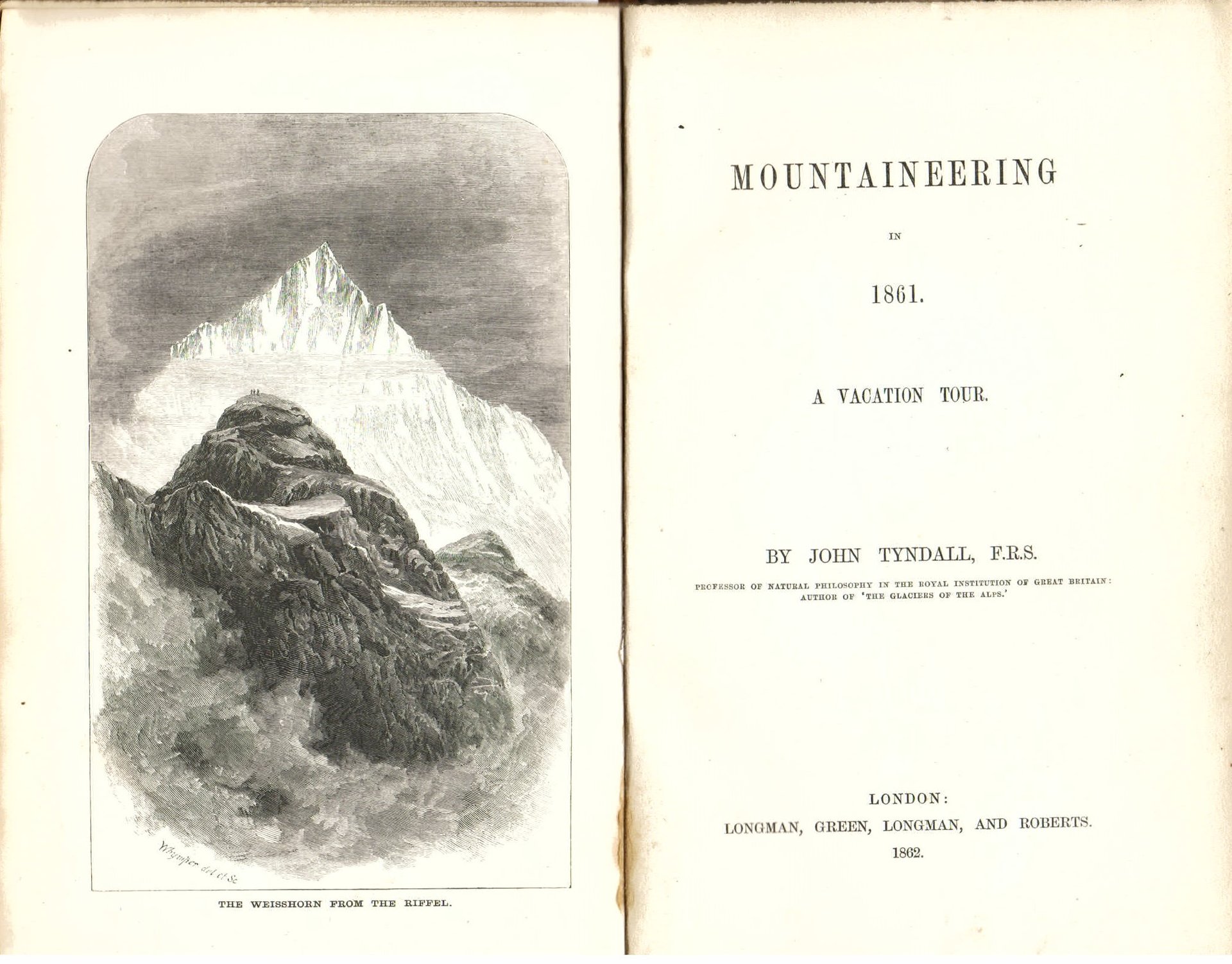 In-8°, pp. VI, (4), 105, (1), 8 di segnalazioni editoriali (2) bianche, legatura editoriale in p. percallina color mattone relizzata da Edmonds & Remnants di Londra con titolo dorato impresso verticalmente al dorso. Antiporta incisa (Mathews) con veduta del Weisshorn dal Riffel; veduta del Matterhorn (Cooke). Lievi restauri conservativi alle cuffie. Timbri ed etichetta del tempo della Coleraine Library. Buon esemplare. Prima edizione. Il volume contiene fra l'altro il resoconto della prima ascensione del Weisshorn, la più importante impresa alpinistica del Tyndall. Perret, 4355: 'Le professeur Tyndall a été l'un des rares alpinistes britanniques de l'âge d'or à bénéficier d'une traduction de ses principaux récits d'ascensions en français'. Neate, 837: 'From a scientific beginning, [Tyndall] took more and more to the pleasures of mountaineering, his greatest climb being the first ascent of the Weisshorn. He was also a contender for the first ascent of the Matterhorn.'. Cox, Classics in the Literature of Mountaineering, 15: 'The Golden Age of mountaineering produced a literature which has yet to be surpassed. . .The British scientist, John Tyndall, was an outstanding example of these pioneers. 1861 was his great year of climbing. He mad the first ascent of the Weisshorn and made an early attempt on the Matterhorn, which is described in this work'.