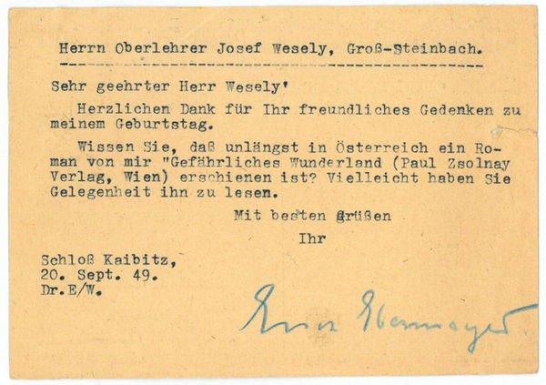 1 S. Qu.-8vo. Dankt Josef Wesely für ihm übersandte Geburtstagswünsche: “Wissen Sie, daß unlängst in Österreich ein Roman von mir ‘Gefährliches Wunderland’ (Paul Zsolnay Verlag, Wien) erschienen ist! [.]” - Nach abgeschlossener Berufsausbildung anfänglich als Rechtsanwalt tätig, gelang Erich Ebermayer 1929 mit dem Roman "Kampf um Odilienberg", der nach 1933 verboten wurde, der literarische Durchbruch. Als Chefdramaturg und Regisseur am Schauspielhaus Leipzig tätig, wurde er 1934 auf Betreiben der Nationalsozialisten entlassen, war dann als Drehbuchautor (u. a. von Carl Froelichs ‘Traumulus’) tätig, geriet jedoch wiederholt mit den Nationalsozialisten in Konflikt und zog sich 1939 auf Schloß Kaibitz (Oberpfalz) zurück. Nach Ende des Krieges wieder Rechtsanwalt, trat er als Verteidiger in Entnazifizierungsprozessen auf, schrieb weiter Drehbücher (u. a. zu Alfred Weidenmanns ‘Canaris’, 1954), Komödien und zwei Tagebücher aus der Zeit des Nationalsozialismus: ‘Denn heute gehört uns Deutschland .’ (1959), ‘. und morgen die ganze Welt’ (1966). Vgl. Kosch III, 765f.