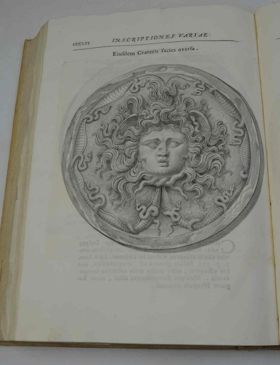 In-folio (cm. 36,5), pp. (20) xii, 519 (1). Antiporta figurata con il prospetto del museo, frontespizio in rosso e nero, testate, capolettera, molte figure nel testo e 33 tavole di cui 2 ripiegate fuori testo. Il tutto finemente inciso in rame. Solida ed elegante legatura coeva in piena pergamena rigida con nervi passanti, dorso a nervi con titoli e fregio tenuamente manoscritti. Rilegato in fine troviamo anche il testo: CIRIACO (d'Ancona): Inscriptiones, seu epigrammata Græca, et Latina reperta per Illyricum a Cyriaco Anconitano apud Liburniam designatis locis, ubi quæque inventa sunt cum Descriptione Itineris. Romae, Roiseccum, 1747. Pp. (2) xxxxiv. Con figure incise nel testo. Esemplare genuino, ed in eccellente stato di conservazione. Opera affascinante, munita di un apparato iconografico di grande interesse e bellezza. Cfr. Cicognara (3123): "Immensa è la copia delle Iscrizioni raccolte, e illustrate da questo dottissimo letterato, e distribuita in questo volume... dedicato a Benedetto XVI...".