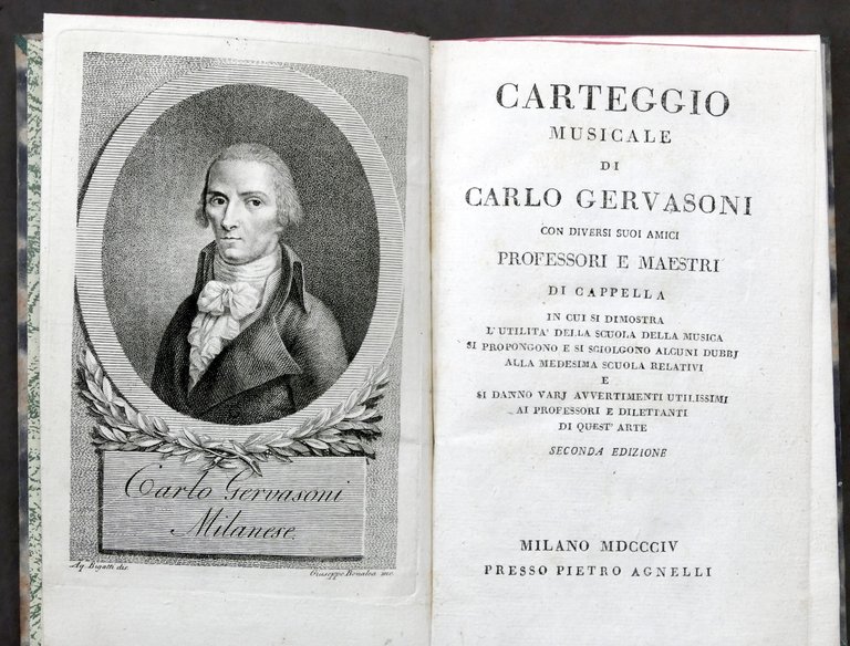 Musica *** RARITA' *** Carteggio musicale di Carlo Gervasoni con diversi suoi amici professori e maestri di cappella. In cui si dimostra l'utilità della scuola della musica si propongono e si sciolgono alcuni dubbj alla medesima scuola relativi e si danno varj avvertimenti utilissimi ai professori e dilettanti di quest'arte. Milano, presso Pietro Agnelli, seconda edizione 1804 Pag. 149, [3] - Antiporta calcografica con ritratto dell'autore disegnato da Aq. Bigatti e inciso da Giuseppe Benalea. Copertina rigida non originale - Testo in italiano. Condizioni molto buone.
