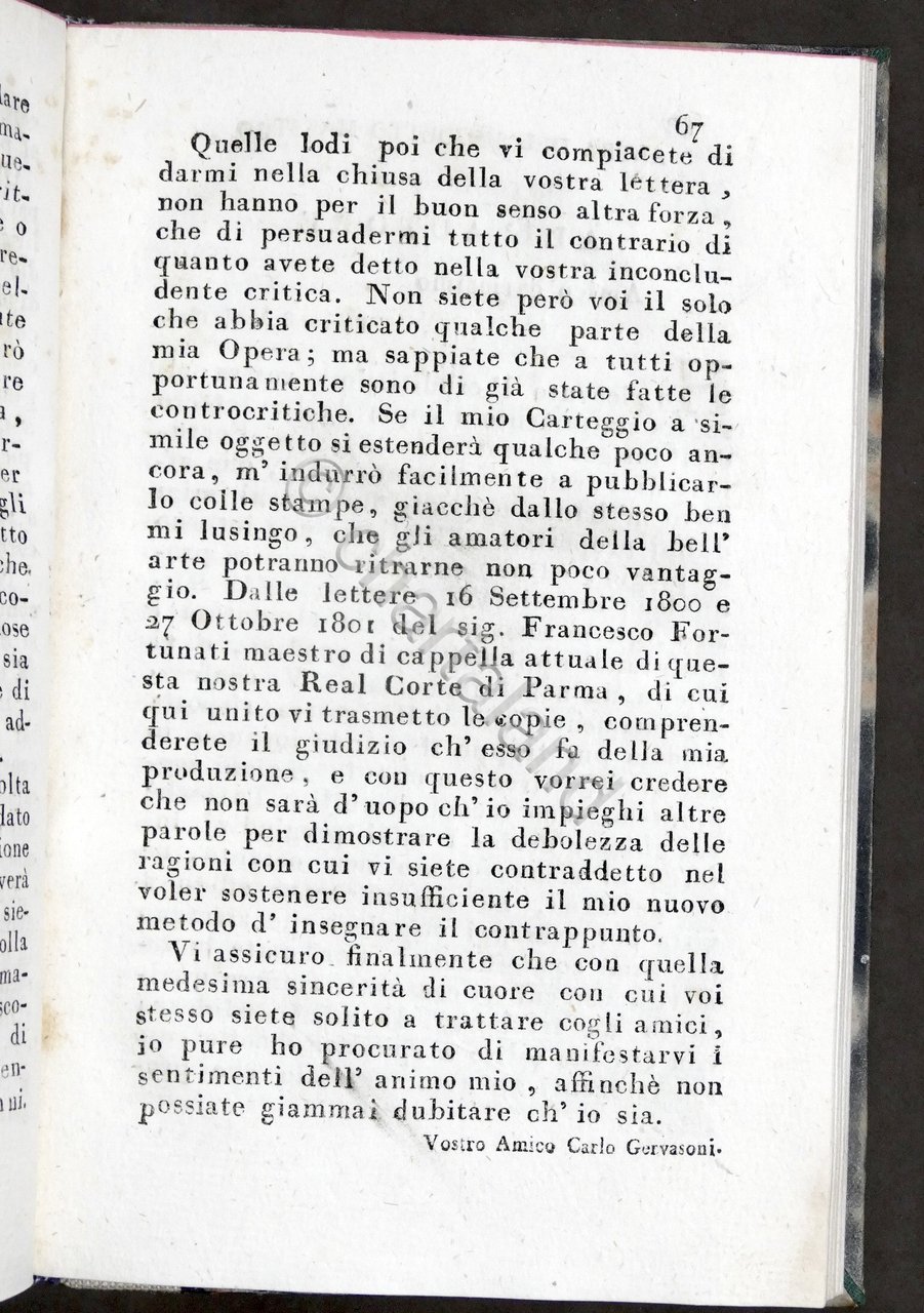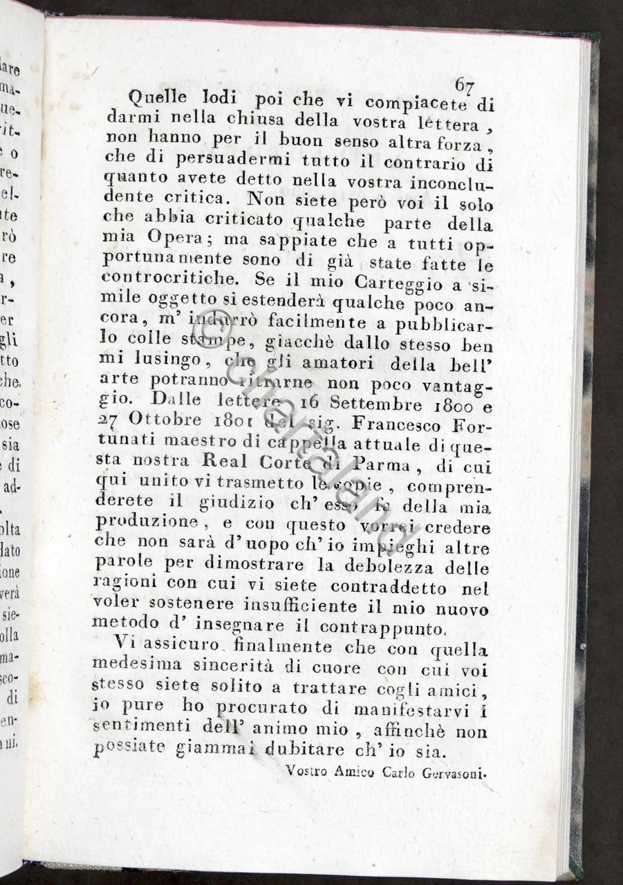 Musica - Carteggio musicale di Carlo Gervasoni - 1804 - RARO