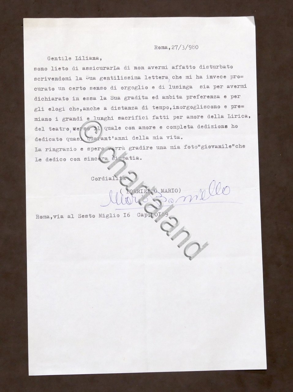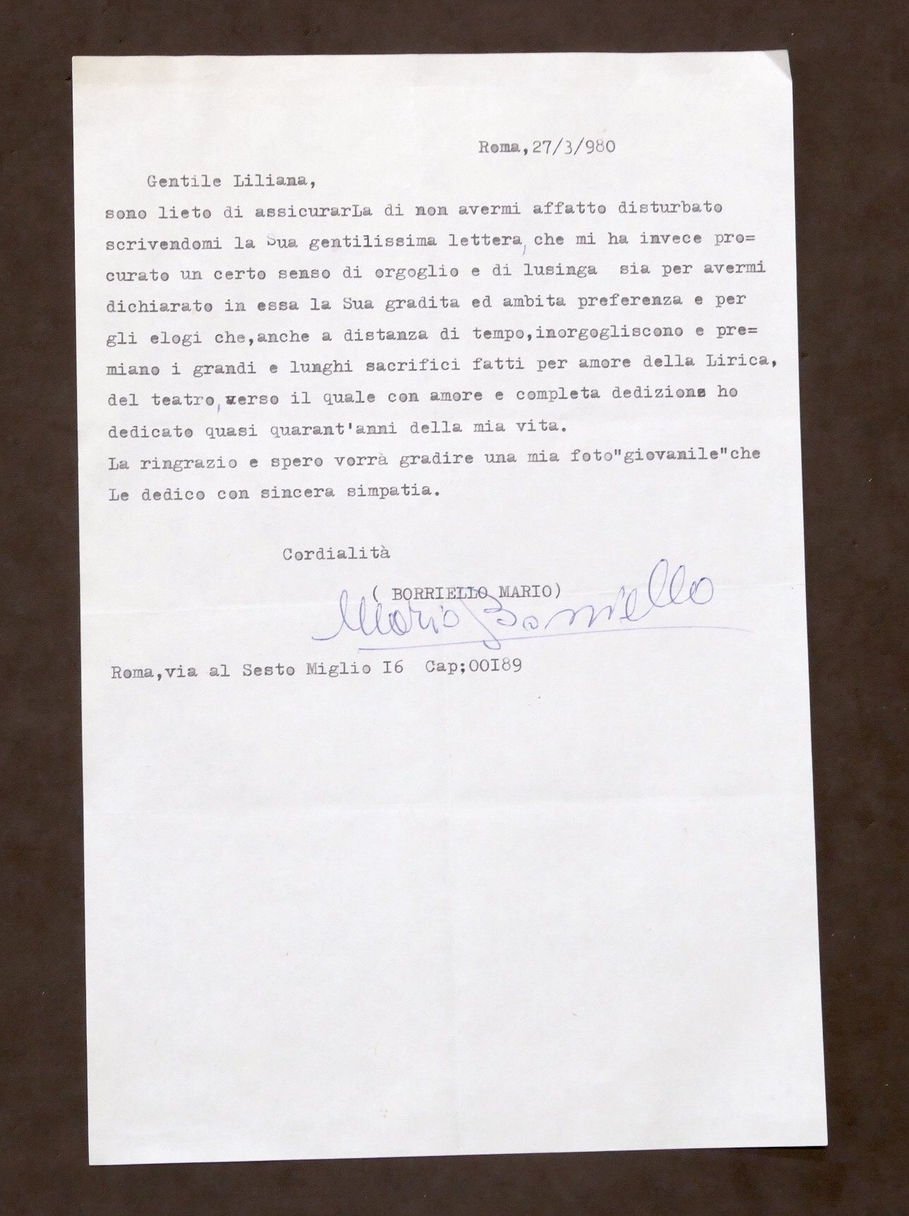 Musica Lirica - Lettera con autografo del baritono Mario Borriello - 1980