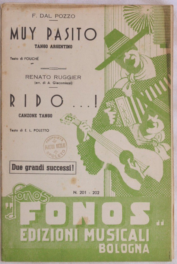 In 8. cm 27x18. pp 17. partitura completa per orchestra del 1939 di due canzoni. Caratteristica copertina illustrata. Ex libris sulla copertina ed in qualche pagina. Ottime condizioni. a complete score for orchestra of 1939. Carachteristic decorated cover of that period. Ex libris in the cover and in some pages. Very good conditions.