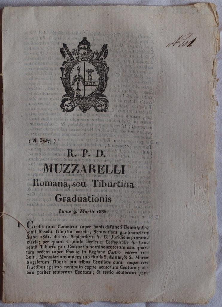 In 4. Dim. 29x21,5 cm. Pp. (4). Interessante pubblicazione del 1835, una sentenza del Tribunale della Sacra Rota del 9 Marzo 1835 per una causa nella diocesi di Roma. Si tratta della causa per il Consorso dei creditori sui beni del defunto Antonio Boschi di Tiburtina. La graduatoria venne pronunciata nel 1831: il Capitolo della Chiesa della Cattedrale di S. Lorenzo e il Monastero di S. Anna e S. Maria degli Angeli. Protestarono il Principe Cardinale Giuseppe e i fratelli Albani che gestivano le ipoteche del patrimonio degli altri creditori. In buone condizioni. Copertina assente. Legatura assente. All'interno le pagine si presentano in buone condizioni con fioriture e bruniture. Usure ai margini. Interesting pamphlet of 1835, a sentence of the Trial of Sacra Rota for a trial of 9th of March 1835 in the diocesis of Rome. It is the trial for the Competition for creditories on goods of the dead man Antonio Boschi from Tiburtina. The winners were pronounciated in 1831: the Capitolo della Chiesa della Cattedrale di S. Lorenzo and the Monastero di S. Anna e S. Maria degli Angeli. The Principe Cardinale Giuseppe and the brothers Albani who managed the hypothecaries of the other creditories protested. In good conditions. Cover is missing. Binding is missing. Inside pages are in good conditions with foxings and yellowings. Worn edges and humidity stains. Wormings.