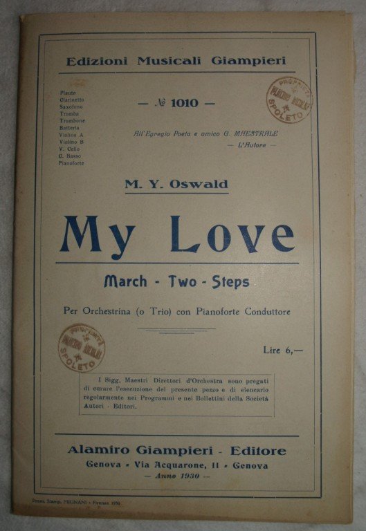 In 8. cm 27x18. Pp. 12. Partitura completa per orchestra del 1930. Caratteristica copertina decorata dell'epoca. Ex libris sulla copertina. Buone condizioni, gora d'umidità al margine inferiore. A complete score for orchestra of 1930. Carachteristic decorated cover of that period. Ex libris in the cover. Good condition, humidity stain int he lower edge.