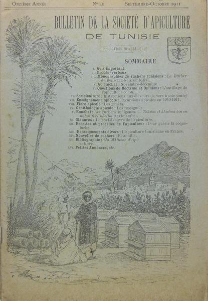 Société d'apiculture de Tunisie, 1911-1912. 2 numéros brochés (24 x 15 cm), illustrations (dessins et photographies), 8 feuillets de texte, 8 feuillets de publicités illustrés par numéro. Monographies de ruchers Tunisiens : Rucher fixiste et mobiliste, de Beni-Taleb, outillage de l'apiculteur colon, flore apicole : Lathyrus silvestris, les genêts, ornithologie apicole : rossignol, Ennehal : les ruchers indigènes, les chasseurs d'abeilles dans les Mogods (textes arabes), recettes pour guérir la coqueluche, hydromel, nouvelles de ruchers : Teboursouk, Zaghouan, El Aouilia, bibliographie, petites annonces, les cours du miel.