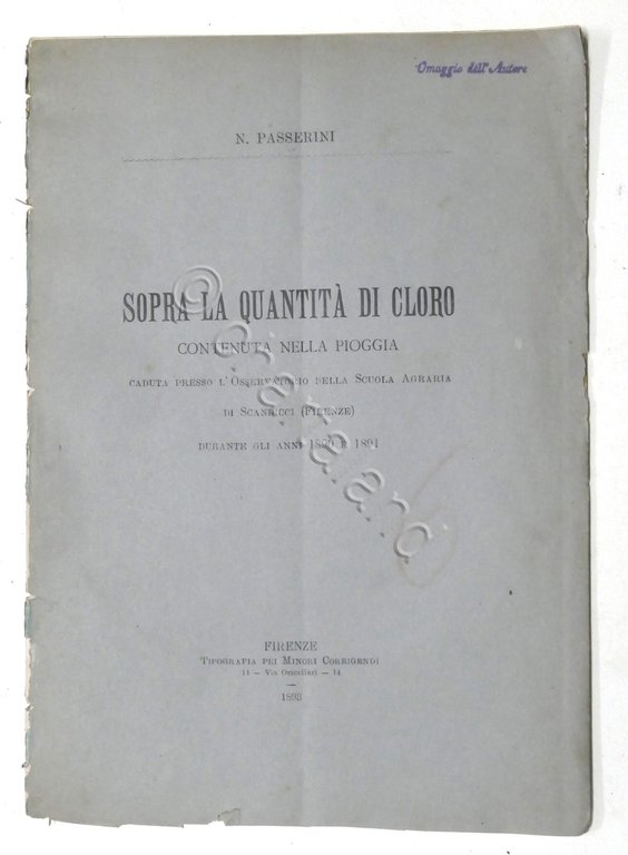 N. Passerini - Sopra la quantit&agrave, di cloro contenuta nella pioggia caduta presso l'Osservatorio della Scuola agraria di Scandicci (Firenze) durante gli anni 1890 e 1891 - ed. 1893