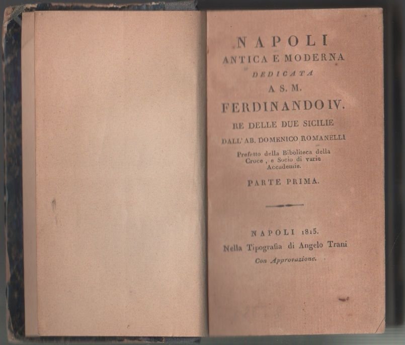 Napoli antica e moderna Domenico Romanelli Domenico Romanelli (1756-1819) fu uno storico, archeologo e abate italiano. Tipografia Trani, 1815. Napoli. Opera in tre volumi rilegati assieme, in 16°; pp. 182+189+218; mezza tela con piatti marmorizzati; 2 tavole incise su rame ripiegate più volte; lieve mancanza alla pagina 23-24 senza perdita di testo; abrasioni alla copertina; dorso leggermente sbiadito; interno molto buono. 14B-27