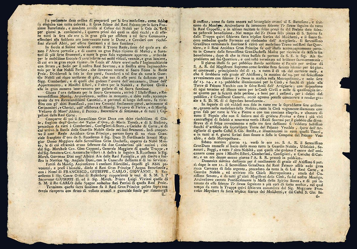 In 4to (mm 245x180), pp. (4). Note manoscritte al margine superiore della prima carta, aloni e fioriture diffuse, minime mancanze lungo la piegatura che tuttavia non interessano il testo. Pubblicato non prima del 1768, anno di nascita dell'Arciduca Francesco Giuseppe Carlo Giovanni d'Asburgo-Lorena, il futuro imperatore Francesco II.