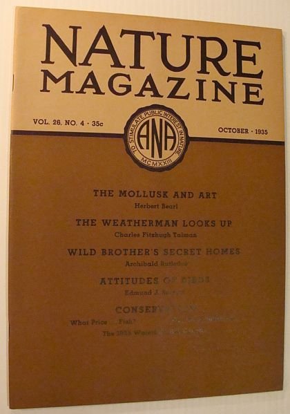 - Nature Magazine, October 1935 rotogravure. Features: Wild Brother's Secret homes, The Mollusk and Art - through the centuries it has inspired the, greatest artists, Wol, the Sweet - the tiny owl native to Cuba, Attitudes of Birds - the song sparrow's individual, characteristics, The weather man looks up - the stratosphere, Conservation - the 1935 waterfolw regulations, What Price. Fish?, Land use planning, Bay State Billboards - Massachusetts legislature rejects move of, industry and Governor to ruin landscape, Buy who pays? - another row between the Forest Service and the, Park Service, Through the Telescope Natural History Magazine Back Issues