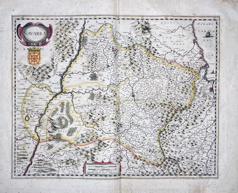 Amsterdam, Handrik Hondius, [prima metà del XVII secolo], carta geografica incisa in rame, mm. 382x490 (l'impronta della lastra), mm. 487x586 (il foglio). Confini, stemma del Regno di Navarra e cartiglio accuratamente acquerellati d'epoca. Una piega centrale con la quale la carta è stata conservata. Al verso del foglio è presente un testo a stampa in francese che descrive il regno di Navarra.