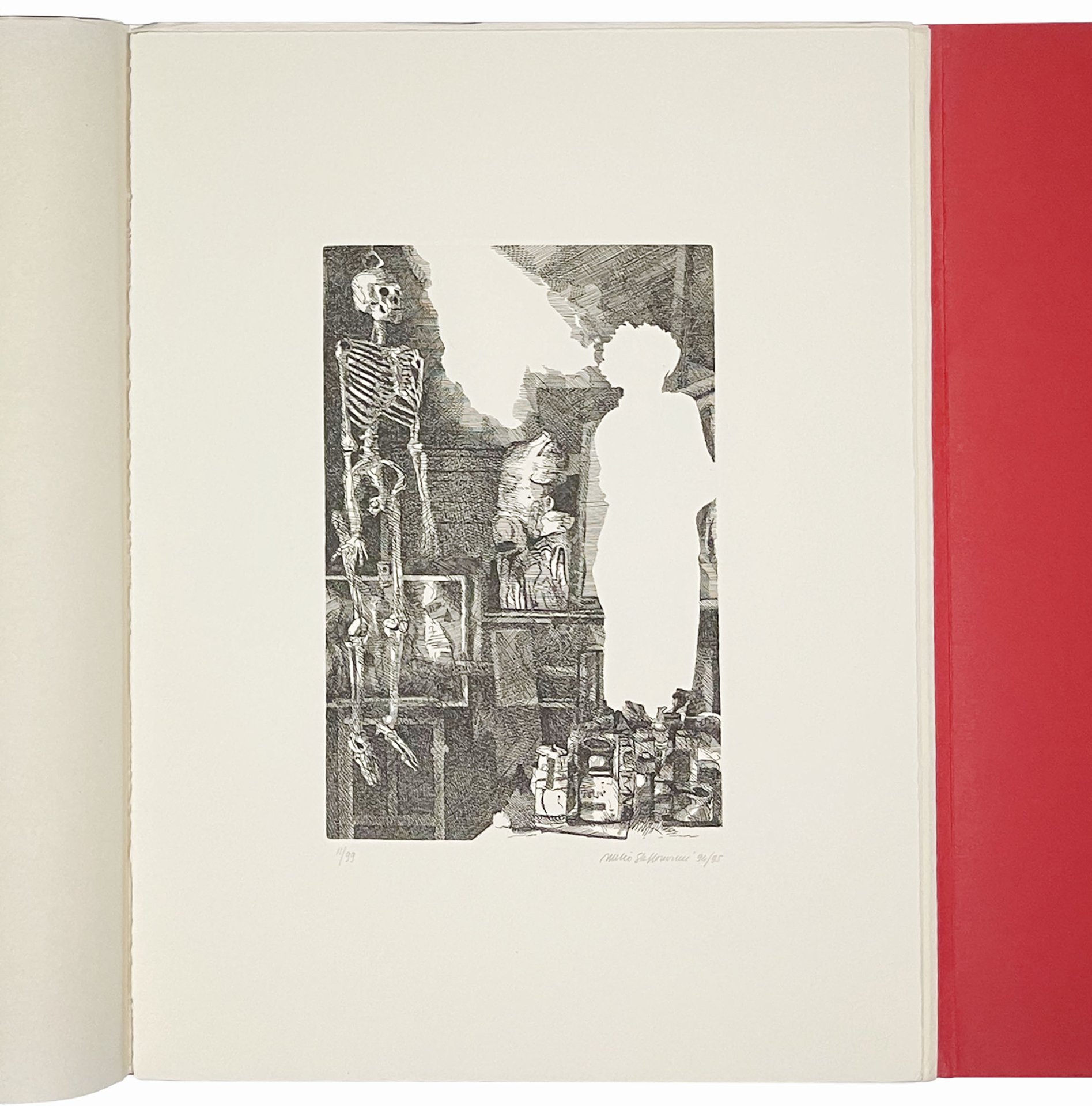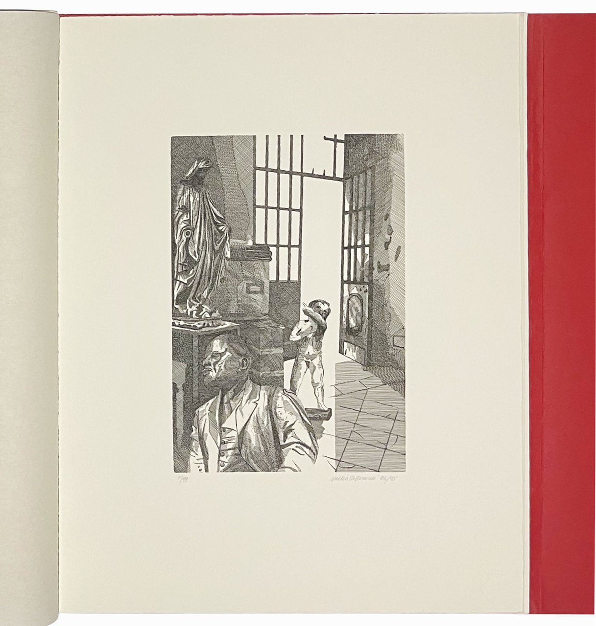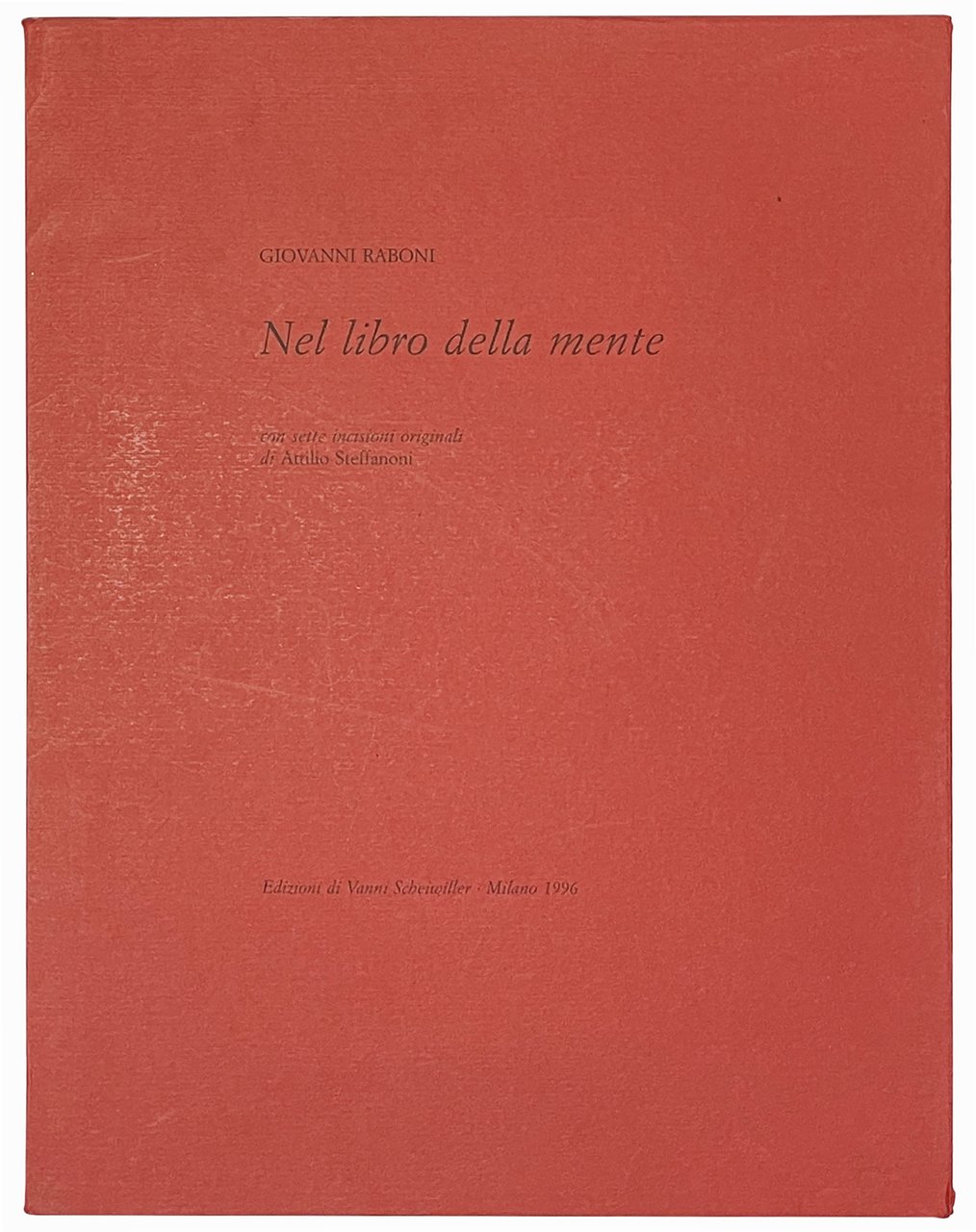 Mm. 413x312. Pp. 16, [7] carte di tavv. Con 12 sonetti di Giovanni Raboni e 7 incisioni originali f.t. protette da velina, numerate e firmate dall'artista Attilio Steffanoni. Le incisioni all'acquaforte sono state tirate con i torchi della stamperia Scotti di Caravaggio. In-folio sciolto in cartella editoriale rossa, stampato da Giorgio Lucini. Edizione in tiratura limitata di 99 esemplari numerati più 10 numerati da I a X (ns copia nr. 11). Ottima copia.