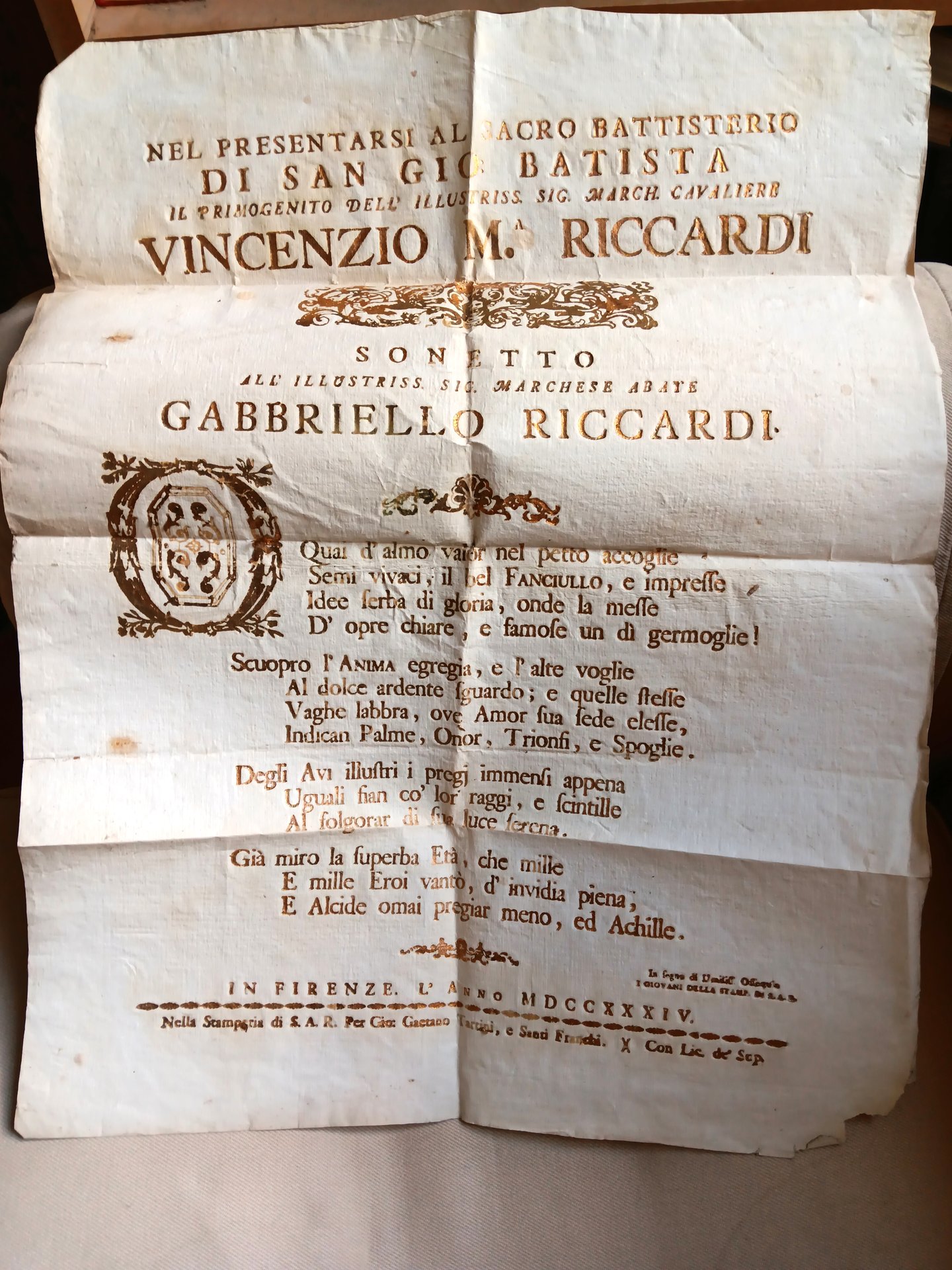 Manifesto (47x40) con lettere stampate in oro, dedicato al primogenito del Marchese Vincenzo Riccardi, Gabriello Riccardi.