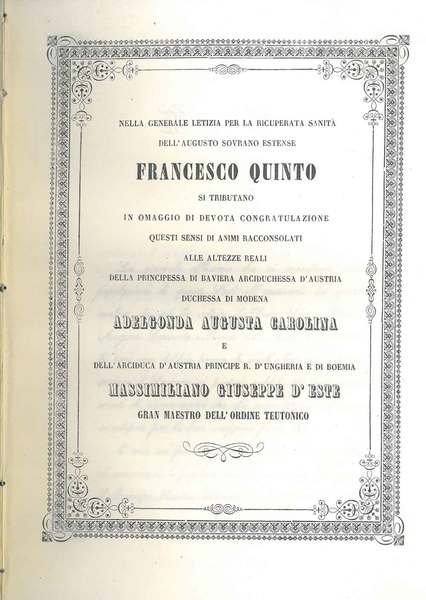 Nella generale letizia per la ricuperata sanità dell'augusto sovrano estense Francesco Quinto si tributano in omaggio di devota congratulazione questi sensi di animi racconsolati alle altezze reali della principessa di Baviera arciduchessa d'Austria duch