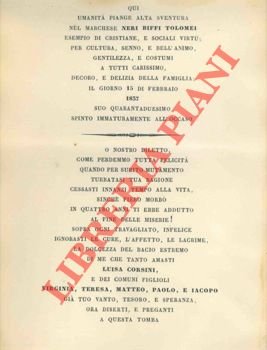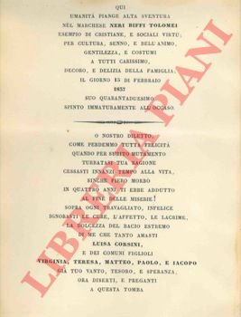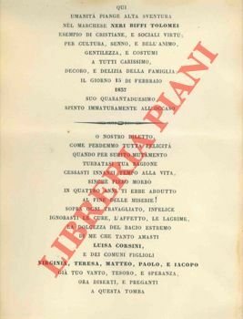 Foglio, 1837, cm. 30 x 21 con necrologio in italiano. Bordo superiore rifilato.