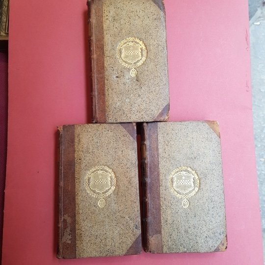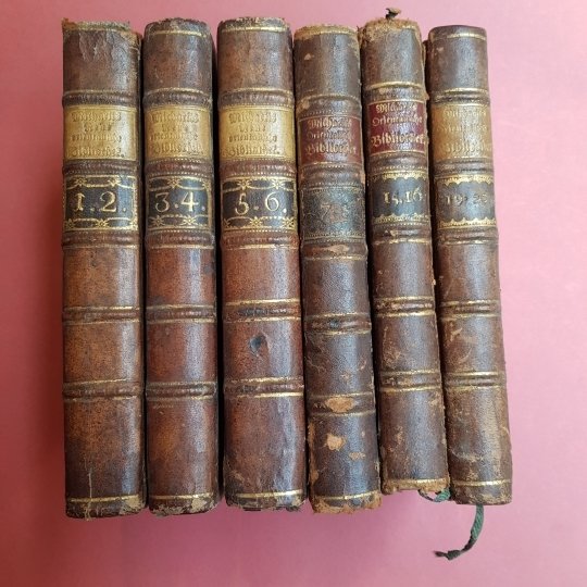 12 voll. in 6 tomi in-16°, circa 200 pp. ogni volume, due tavv. f.t., bella ed affascinante legatura in mezza pelle con angoli, doro a cinque nervi con titolo in oro su tassello, ai piatti stemma araldico impresso in oro. Raccolta parziale di una delle più importanti riviste tedesche del XVIII secolo sulle lingue orientali, soprattutto semitiche. Conteneva recensioni di tutti i libri pubblicati che riguardavano, anche solo marginalmente, il campo degli studi biblici, oltre a resoconti di viaggio in Oriente, come il celebre Viaggio in Arabia di Niebuhr.