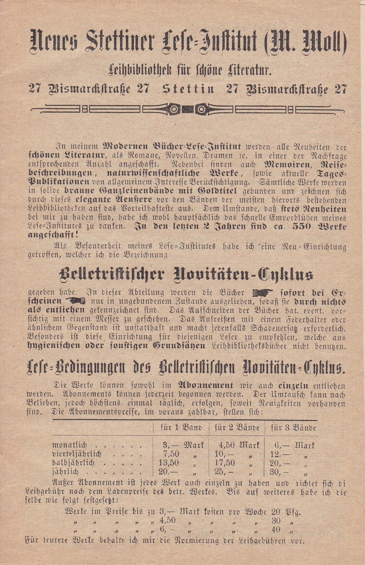 Neues Stettiner Lese-Institut (M. Moll). | Libri antichi e moderni | Stettin.