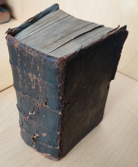 • Schlichter Ganzleder-Einband der Zeit auf Holzdeckeln gebunden, Deckel-Schließe wurde wohl vor längerer Zeit entfernt.