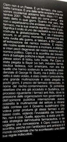 Cipro non è un paese. È un farmaco che combatte l'antrace. E la sua vicenda significa il crollo di uno dei capisaldi su cui è stata costruita la globalizzazione. Con Cipro il diritto al brevetto è stato violato, è stato creato il precedente, una grande multinazionale è stata piegata in pochi giorni, il prezzo del farmaco dimezzato. In nome del rischio contaminazione. La lettura del mondo di giornalisti, esperti e volontari prodotta, direttamente o indirettamente, dagli ambienti vicini alla solidarietà è disincantata e lucida, non preconfezionata, molto diversa da quella che quotidianamente ci propongono i mezzi d'informazione tradizionali. Un libro che ci serve per capire la regia degli avvenimenti e per tentare di migliorare il nostro rapporto con il mondo: la grandezza di una civiltà si misura anche dalla capacità di condivisione delle proprie risorse con chi ne ha bisogno.