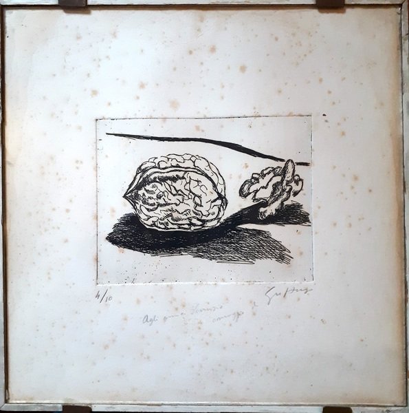 Piccola acquaforte di Renato Guttuso rappresentante una noce e il gheriglio, firmata e numerata 4/10, con dedica. L’incisione misura 9x12 cm.Small etching by Renato Guttuso representing a walnut and the kernel, signed and numbered 4/10, with dedication. The engraving measures 9x12 cm.