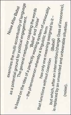 Noise after Babel is the result of artistic-theoretical research. It examines the multi-accentuality of language as a potential ground for political engagement. Our general metaphor coupling the words “Babel” and “noise” is based on the idea of a perfectly working system of univocality – the phenomenon whereby a linguistic term has only one meaning assigned to it – that functions without coercion (Babel) but which, after an intervention/change (loss of innocence), is replaced by an unwanted and unbearable situation (noise). The book is authored by Sezgin Boynik and Minna Henriksson, and it contains contributions by Antti ‘Eze’ Eskelinen, Alpo Jaakola, Rastko Močnik, Eetu Viren, and Milena Solomun as well as interviews with researchers Liban Ali Hersi, Minna Hjort, Ulla Horstia, Salli Kankaanpää, Mika Lähteenmäki, Lauri Siisiäinen, and Klaas Ruppel. — Testi: Boynik Sezgin. F.to: 12x19; pagg. 352; 56 BN; rileg. brossura. Editore: Spector Books, Leipzig, 2015.