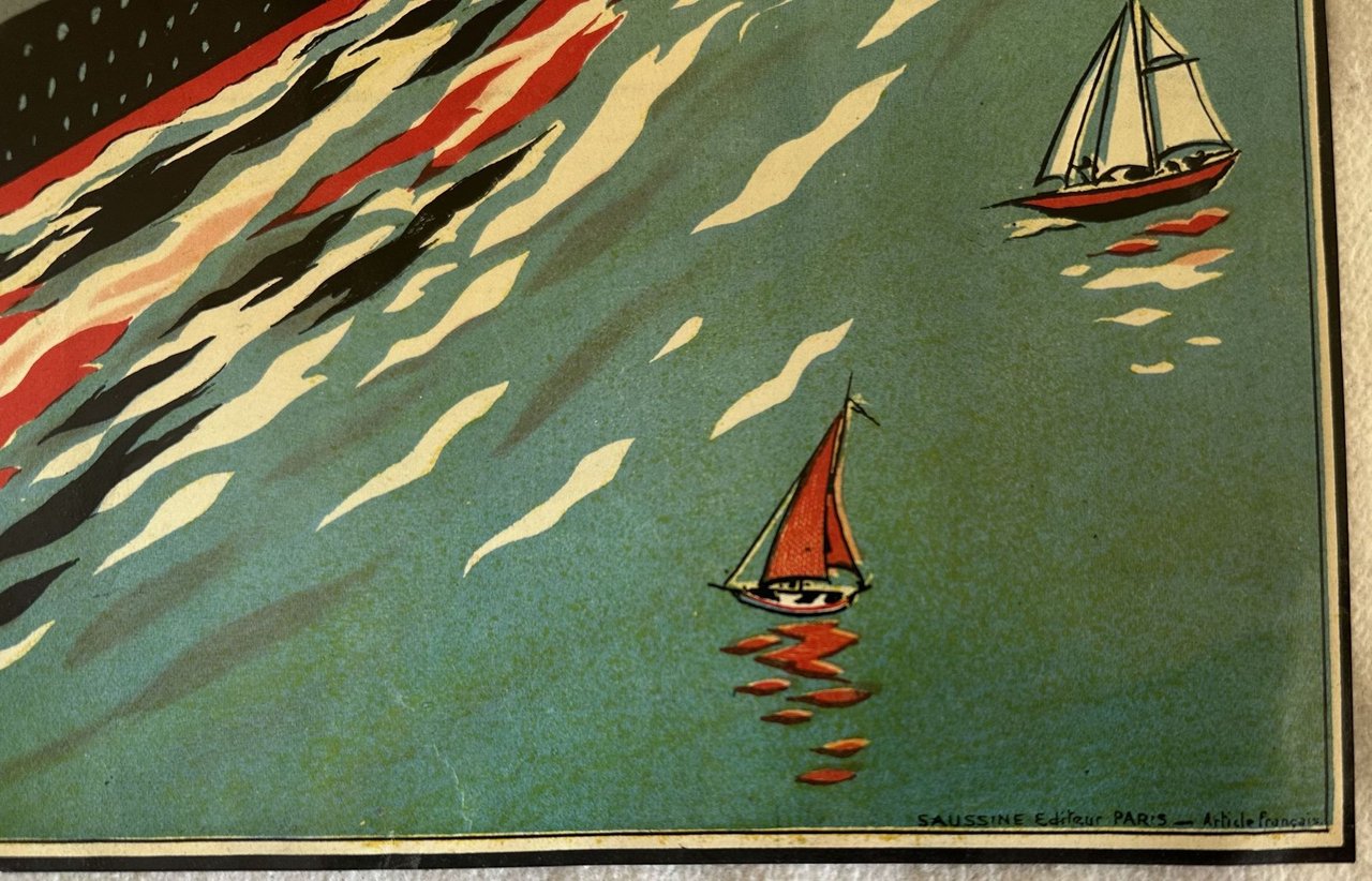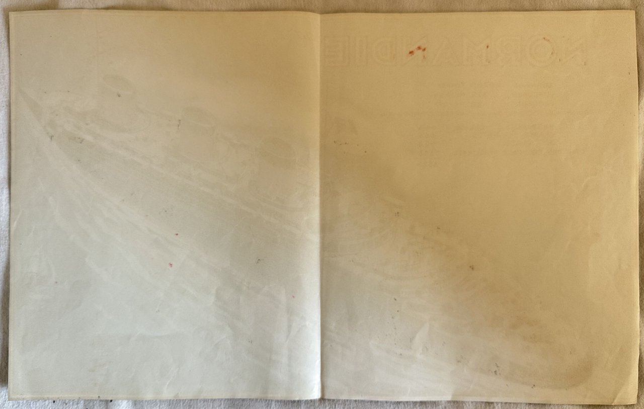 Rarissima locandina pubblicitaria del 1935 circa (antecedente il 1936 quando la stazza aumentò nel 83.423) del transatlantico "Normandie", il più veloce mai realizzato che riusciva a percorrere la rotta Le Havre- New York in soli quattro giorni e mezzo. Destinato a una clientela molto facoltosa, i suoi interni erano di gran lunga più lussuosi di qualsiasi nave mai costruita prima. Piegatura verticale. In buone condizioni. Dim. cm 46,5x29.Very scarce advertising poster of 1935 circa (before 1936 when the weight increased 83.423) og transatlantic "Normandie", the fastest boat ever realized which managed the route Le Havre- New York in four days and half. It was the most luxuous boat ever realized and destinated to a rich customers. Vertical folding. In good conditions Dim. cm 46,5x29.<BR><BR> <BR><BR>