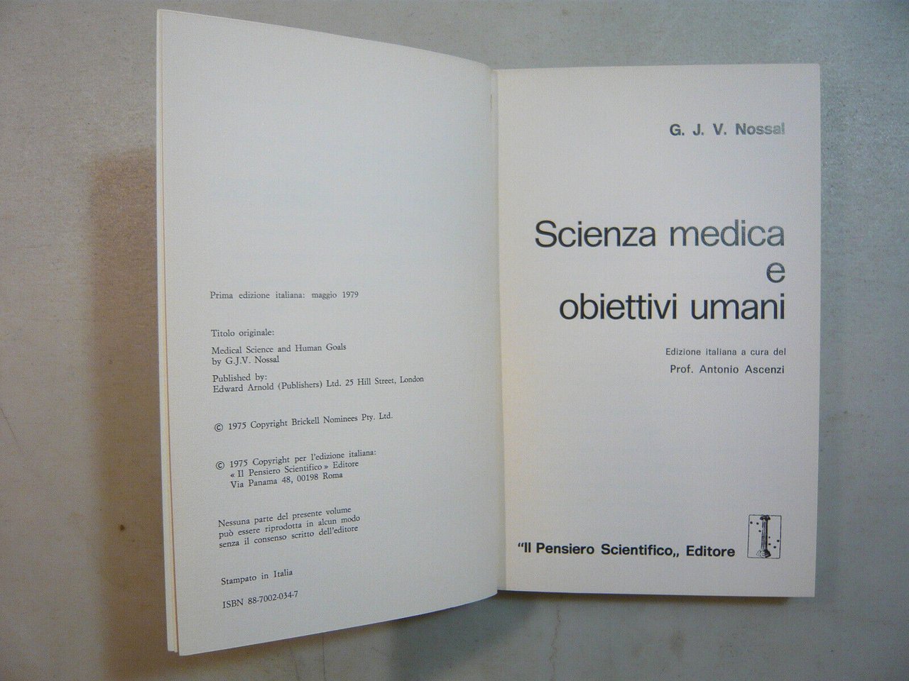 Nossal,SCIENZA MEDICA E OBIETTIVI UMANI,Il Pensiero Scientifico editore 1979