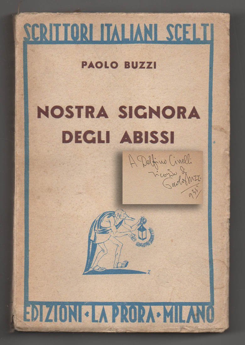 LIBROEdizione originale.CON AUTOGRAFO.Ottimo esemplare, in parte intonso, pregiato dalla dedica autografa dell’autore a Delfino Cinelli.«Esaltazione di Milano e della sua storia» («Dizionario biografico degli Italiani») che calca il titolo di «Notre dame de Paris». L’espressione «Nostra signora degli abissi» era già comparsa nell’«Ellisse e la spirale» come titolo di una sezione. Scrisse Buzzi a Ferrieri che «i miei romanzi-poemi “Le Dannazioni”, “Le Beatitudini”, e quello che sto elaborando “Nostra Signora degli Abissi” sono appunto della consacrazioni d'ordine creativo alla modernissima “Voce di Pan”» (Ferrieri, «La radio! la radio? la radio!», Milano 2002, p. 83). Definendolo il «romanzo più valido per mobilità di fantasia, ricchezza d'invenzione e omogeneità stilistica», scrive Ettore Mazzali che «In “Nostra Signora degli abissi” (1935), lo stile corrisponde duttilmente, nell'ambito di una più oculata maturità espressiva, a un raro stato di grazia inventiva. Il Duomo di Milano è trasfigurato in una costruzione pelasgica, in una città sotterranea, che entra in una favolosa osmosi con le città di superficie. […]. L'esemplare stile dannunziano tace; il moto astraente che abbiamo detto futurista assorbe e alimenta la “prosa lombarda”» (Letteratura italiana: I maggiori, 1974, pp. 61-2 e 72-3).Cammarota, Futurismo, 68.30