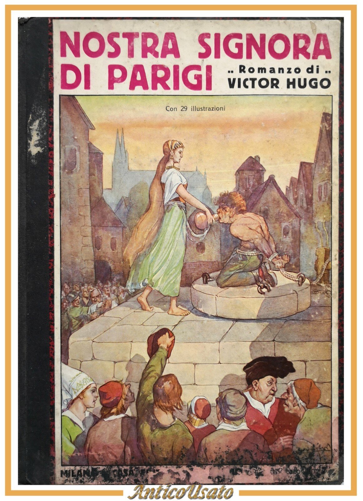 NOSTRA SIGNORA DI PARIGI romanzo di Victor Hugo. Editore Sonzogno, senza data ma presumibilmente anni '30. 219 pagine, 29 illustrazioni in bianco e nero nel testo. Copertina non editoriale in mezza tela (conserva i piatti originali applicati). Stato di conservazione: buono (pagine ingiallite, firma di appartenenza, copertina un po' sporca) Libro usato narrativa romanzo storico illustrato