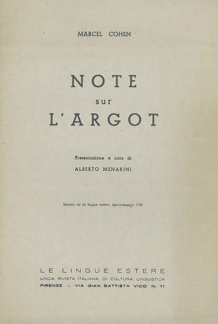Note sull'argot Presentazione e note di A. Menarini Estratto da "Le Lingue estere"