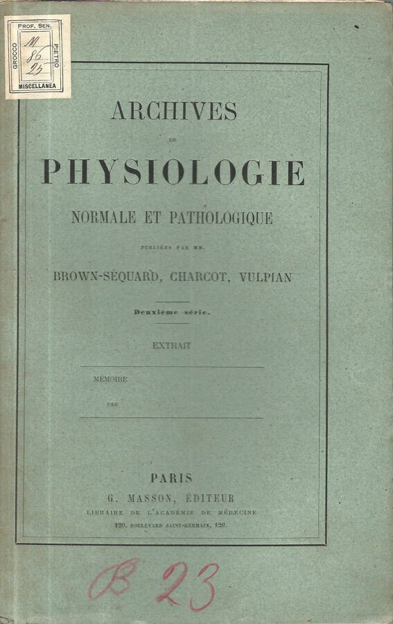 Piatti con imbrunitura, prima di copertina con etichetta della vecchia biblioteca di appartenenza ed annotazione a matita colorata, testo completamente fruibile, pagine intonse, con note a piè di pagina e 2 tavole fuori testo con figure a colori, estratto dagli Archives de Physiologie Normale et Pathologique. Numero pagine 11