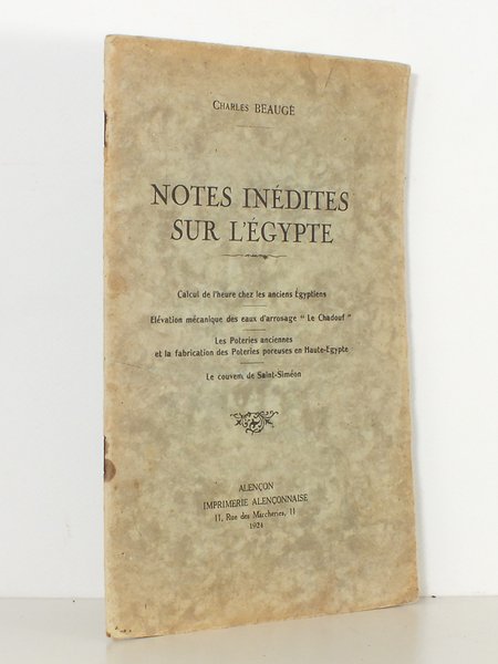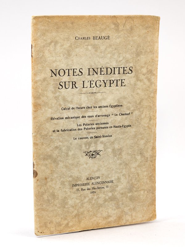 Notes inédites sur l'Egypte - Calcul de l'heure chez les anciens Egyptiens ; Elévation mécanique des eaux d'arrosage 'Le Chadouf' ; Les Poteries anciennes et la Fabrication des poteries poreuses en Haute-Egypte ; Le Couvent de Saint Siméon