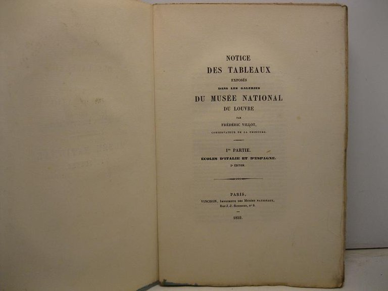 In 8, pp. LVII  + (1) + 277 + (1b). Lievi mancanze al d. Br. rifatta con etichetta con titolo e aut. al p. ant. e al d. Prima parte, dedicata alle scuole spagnola e italiana, della seconda edizione della guida di Villot alle opere del Louvre. Bell'esemplare ad ampi margini su carta grave.