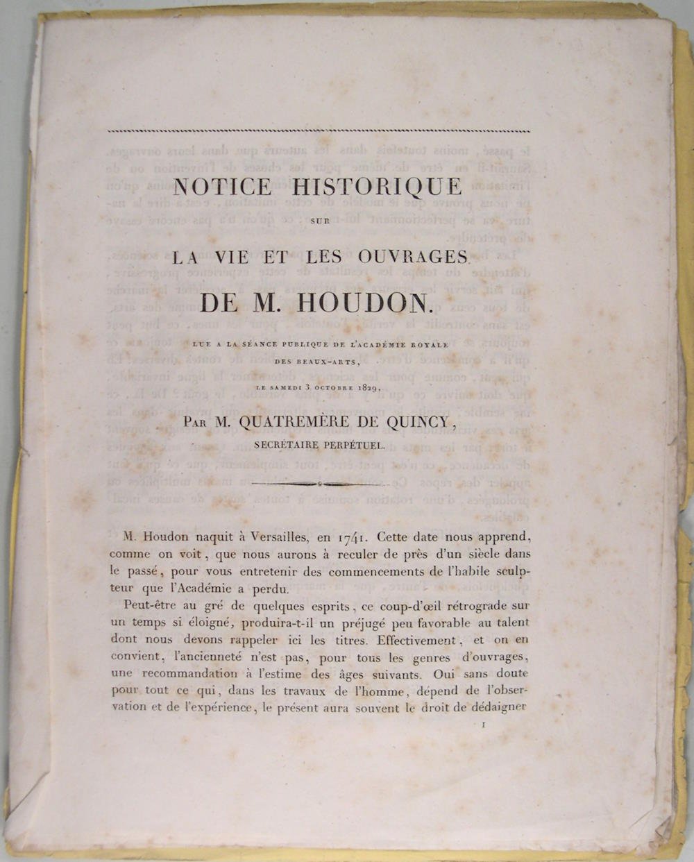 s.l., 1829. Plaquette in/4 (27 x 22 cm) broché en couverture d'attente, 10 pages. Rousseurs. Lue à la séance publique de l'Académie Royale, des Beaux Arts le 2 octobre 1841. Jean-Antoine Houdon : Né à Versailles en 1741, entre très jeune à l’Ecole royale des élèves protégés, où il s’adonne à la sculpture. En 1761, il remporte le concours du Prix de Rome, ville dans laquelle il séjournera de 1764 à 1768. Il y réalise, en 1767, son célèbre Ecorché, qui témoigne de son vif intérêt pour l’anatomie du corps humain, autant que de sa volonté de reproduire fidèlement la nature.