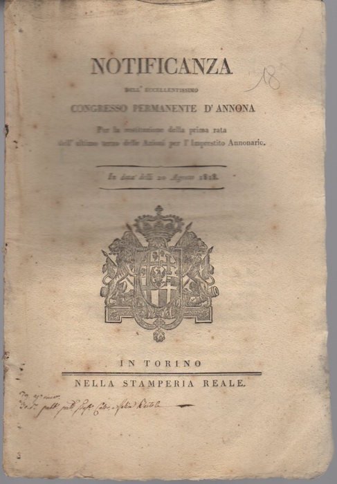 Notificanza dell'eccellentissimo congresso permanente d'annona per la restituzione della prima rata dell'ultimo terzo delle azioni per l'imprestito annonario.