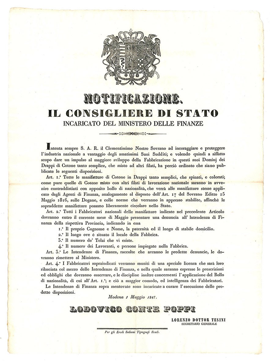 Notificazione del 1 Maggio 1847, con la quale si intendeva dare impulso alla fabbricazione dei drappi di cotone.
