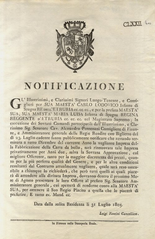 “notificazione”. S.M. Carlo Lodovico Infante di Spagna, Re dell'Etruria, e per la Prefata M.S. Sua Maestà Maria Luisa, Regina Reggente d'Etruria. Fanno pubblicamente notificare che restando terminata a tutto Dicembre del corrente Anno la vegliante Impresa della Fabbricazione della Carta da bollo, sarà rinnuovata tale Impresa privatamente per Anni due, salva la Sovrana Approvazione, col migliore Offerente. Firmato in calce: Lugi Fantini, Cancelliere.