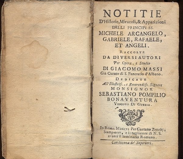 Notitie d'historie, miracoli e apparizioni deggli Principi SS. Michele Arcangelo, Gabriele, Rafaele, et Angeli. Raccolte da diversi autori , per opera e studio di Giacomo Massi.