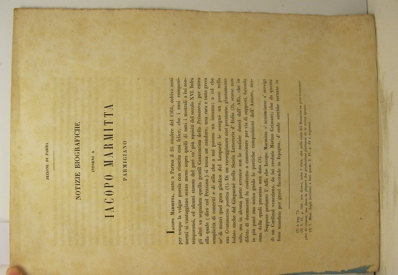 In 4, pp. 149-156. Br. rifatta con carta d'epoca. Estratto dagli Atti e Memorie delle Regie Deputazioni di Storia Patria per le Province Modenesi e Parmensi. Saggio relativo al poeta parmense Iacopo Marmitta nato nel 1504, autore della canzone Primavera.
