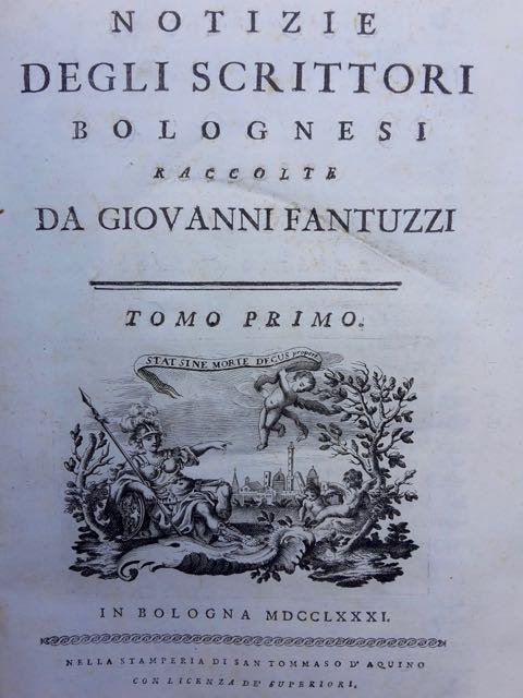 9 volumi in-folio (cm. 30), legature di poco successive in m. pelle (segni d'usura, alcuni risguardi rimontati, dorso del quarto tomo restaurato); vignetta in rame a ogni frontespizio con la città felsinea sullo sfondo, testatine e fregi. Edizione originale nata in collaborazione con i maggiori letterati bolognesi, in particolare con il gesuita Francesco Alessio Fiori (1718-90). E' opera fondamentale di erudizione e di propaganda della tradizione culturale bolognese. Buon esemplare. (SK2)